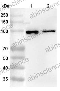 Western blot analysis was performed using anti-VPS16 polyclonal antibody at 1μg/ml on various samples. Lane 1: A549 cell lysate Lane 2: MOLT-4 cell lysate