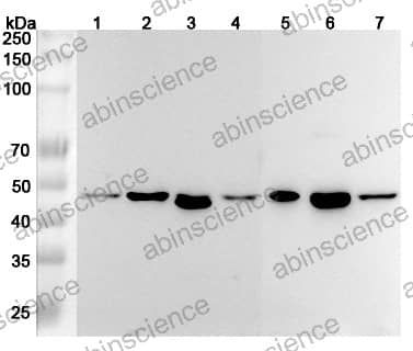 Western blot analysis was performed using anti-RSAD2 polyclonal antibody at 1μg/ml on various samples. Lane 1: HUVEC cell lysate Lane 2: Mouse spleen lysate Lane 3: Mouse brain lysate Lane 4: Mouse lung lysate Lane 5: Rat spleen lysate Lane 6: Rat brain lysate Lane 7: Rat lung lysate