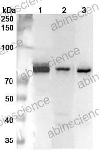 Western blot analysis was performed using anti-PEX5 polyclonal antibody at 1μg/ml on various samples. Lane 1: 293T cell lysate Lane 2: Mouse brain lysate Lane 3: Rat brain lysate