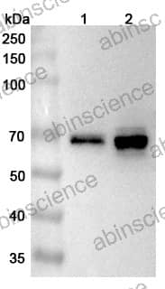 Western blot analysis was performed using anti-EIF2B4 polyclonal antibody at 1μg/ml on various samples. Lane 1: RAW264.7 cell lysate Lane 2: K562 cell lysate