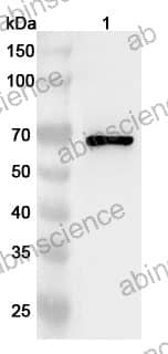 Western blot analysis was performed using anti-HEXIM1 polyclonal antibody at 1ug/mL on various samples. Lane 1: K562 cell lysate