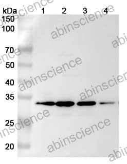 Western blot analysis was performed using anti-METTL1 polyclonal antibody at 1μg/ml on various samples. Lane 1: A549 cell lysate Lane 2: 293T cell lysate Lane 3: HepG2 cell lysate Lane 4: Jurkat cell lysate