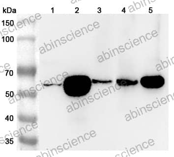 Western blot analysis was performed using anti-ATP6V1B2 polyclonal antibody at 1μg/ml on various samples. Lane 1: 293T cell lysate Lane 2: Mouse kidney lysate Lane 3: Mouse brain lysate Lane 4: Rat kidney lysate Lane 5: Rat brain lysate