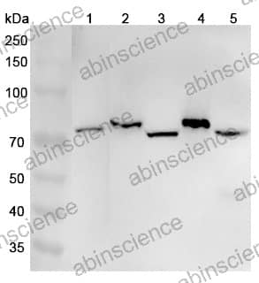 Western blot analysis was performed using anti-EXOC7 polyclonal antibody at 1μg/ml on various samples. Lane 1: NIH3T3 cell lysate Lane 2: Mouse brain lysate Lane 3: Mouse lung lysate Lane 4: Rat brain lysate Lane 5: Rat lung lysate