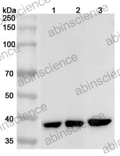 Western blot analysis was performed using anti-GNAO1 polyclonal antibody at 1μg/ml on various samples. Lane 1: Mouse cerebellum lysate Lane 2: Rat brain lysate Lane 3: Rat cerebellum lysate