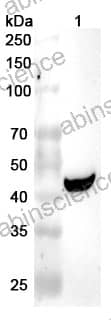Western blot analysis was performed using anti-PELO polyclonal antibody at 1μg/ml on various samples. Lane 1: RAW264.7 cell lysate