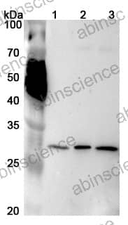 Western blot analysis was performed using anti-PSMA4 polyclonal antibody at 1μg/ml on various samples. Lane 1: BxPC-3 cell lysate Lane 2: K562 cell lysate Lane 3: U937 cell lysate