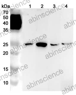 Western blot analysis was performed using anti-LYPLA1 polyclonal antibody at 1μg/ml on various samples. Lane 1: Mouse liver lysate Lane 2: Mouse kidney lysate Lane 3: Rat liver lysate Lane 4: Rat kidney lysate