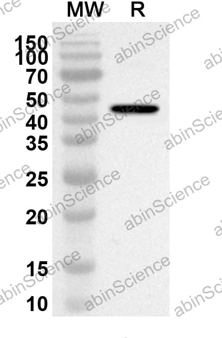Western blot analysis was performed using anti-Human ACADSB polyclonal antibody at 1ug/mL on recombinant Human ACADSB (Catalog No. HW543012).