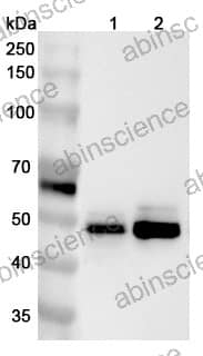Western blot analysis was performed using anti-ALDH3A2 polyclonal antibody at 1μg/ml on various samples. Lane 1: MCF-7 cell lysate Lane 2: Hela cell lysate