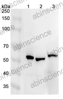 Western blot analysis was performed using anti-ATP6V1B1 polyclonal antibody at 1μg/ml on various samples. Lane 1: Mouse brain lysate Lane 2: Mouse kidney lysate Lane 3: Rat brain lysate