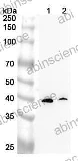 Western blot analysis was performed using anti-DMC1 polyclonal antibody at 1μg/ml on various samples. Lane 1: Mouse testis lysate Lane 2: Rat testis lysate