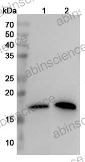 Western blot analysis was performed using anti-MZB1 polyclonal antibody at 1µg/ml on various samples. Lane 1: Raji cell lysate Lane 2: Daudi cell lysate