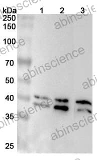Western blot analysis was performed using anti-SET polyclonal antibody at 1µg/ml on various samples. Lane 1: Hela cell lysate Lane 2: HepG2 cell lysate Lane 3: NIH3T3 cell lysate