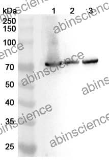 Western blot analysis was performed using anti-STXBP1 polyclonal antibody at 1ug/mL on various samples. Lane 1: Mouse brain lysate Lane 2: Mouse cerebellum lysate Lane 3: Rat cerebellum lysate