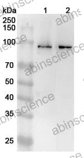 Western blot analysis was performed using anti-LARS2 polyclonal antibody at 1ug/mL on various samples. Lane 1: HepG2 cell lysate Lane 2: Hela cell lysate