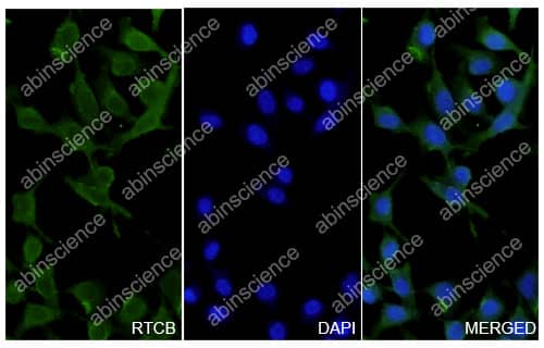 A549 cells were fixed with 4% paraformaldehyde for 20 minutes, followed by blocking with 5% goat serum for 1 hour. The cells were then incubated with a primary antibody targeting RTCB (HV728014) at a concentration of 31.5 ug/ml overnight at 4°C. Afterward, the cells were incubated with a secondary antibody, Goat Anti-Rabbit IgG (Alexa Fluor-488) for 50 minutes at room temperature. The localization of RTCB was visualized (shown in green), and nuclear DNA was stained with DAPI (shown in blue). |