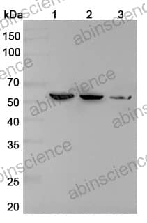 Western blot analysis was performed using anti-RTCB polyclonal antibody at 1μg/ml on various samples. Lane 1: 293T cell lysate Lane 2: Jurkat cell lysate Lane 3: Mouse liver lysate