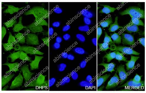 Hela cells were fixed with 4% paraformaldehyde for 20 minutes, followed by blocking with 5% goat serum for 1 hour. The cells were then incubated with a primary antibody targeting DHPS (HW482014) at a concentration of 24 ug/ml overnight at 4°C. Afterward, the cells were incubated with a secondary antibody, Goat Anti-Rabbit IgG (Alexa Fluor-488) for 50 minutes at room temperature. The localization of DHPS was visualized (shown in green), and nuclear DNA was stained with DAPI (shown in blue). |