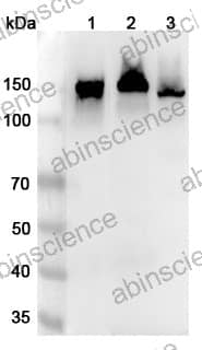 Western blot analysis was performed using anti-CDH2 polyclonal antibody at 1μg/ml on various samples. Lane 1: Mouse heart lysate Lane 2: Rat heart lysate Lane 3: Rat brain lysate