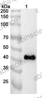 Western blot analysis was performed using anti-ATF4 polyclonal antibody at 1ug/mL on recombinant ATF4 (Catalog No. HB073012). |