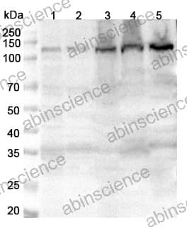 Western blot analysis was performed using anti-DAAM1 polyclonal antibody at 1μg/ml on various samples. Lane 1: Hela cell lysate Lane 2: HepG2 cell lysate Lane 3: Jurkat cell lysate Lane 4: Mouse liver lysate Lane 5: Mouse brain lysate Lane 6: Mouse heart lysate