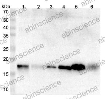 Western blot analysis was performed using anti-MYL9 polyclonal antibody at 1μg/ml on various samples. Lane 1: C2C12 cell lysate Lane 2: Caco2 cell lysate Lane 3: Daudi cell lysate Lane 4: PC12 cell lysate Lane 5: mouse Lung Lane 6: Mouse colon lysate