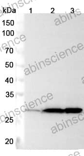 Western blot analysis was performed using anti-CBR3 polyclonal antibody at 1μg/ml on various samples. Lane 1: MCF7 cell lysate Lane 2: Mouse ovary lysate Lane 3: Mouse uterus lysate