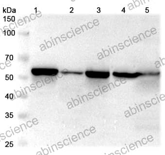 Western blot analysis was performed using anti-LMAN1 polyclonal antibody at 1μg/ml on various samples. Lane 1: HepG2 cell lysate Lane 2: MCF7 cell lysate Lane 3: 293T cell lysate Lane 4: Mouse heart lysate Lane 5: Mouse liver lysate