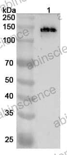 Western blot analysis was performed using anti-ABCC8 polyclonal antibody at 1ug/mL on various samples. Lane 1: Mouse brain lysate