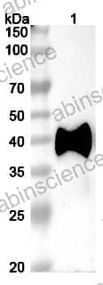 Western blot analysis was performed using anti-TACSTD2/TROP2 monoclonal antibody at 1μg/ml on various samples. Lane 1: recombinant human TACSTD2/TROP2 (Catalog No: HY373011)