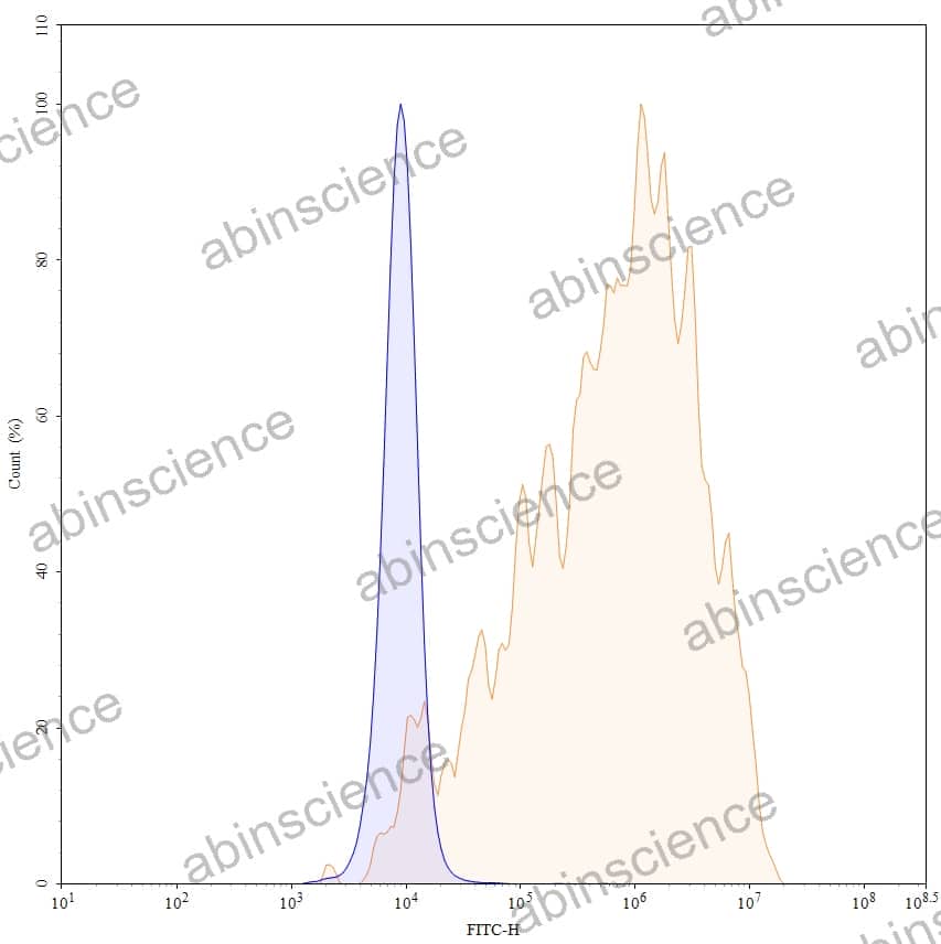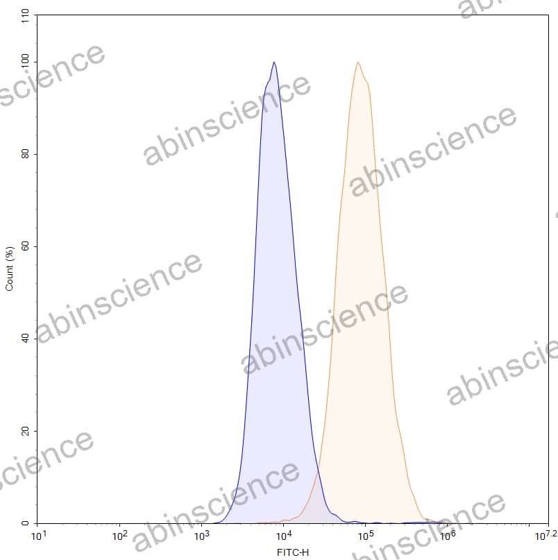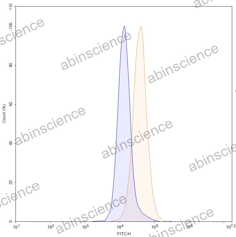 Flow-cytometry using anti-human TACSTD2 antibody. Untransfected cells (blue Histogram) and Transfected cells (Yellow Histogram) were stained with an anti-human TACSTD2 monoclonal antibody (Catalog: HY373026) at a concentration of 5 µg/ml for 30 mins at RT. After washing, bound antibody was detected using a Goat Anti-Human IgG H&L Polyclonal Antibody, FITC (abinScience: HF690414) and cells analysed on a NovoCyte Flow Cytometer.