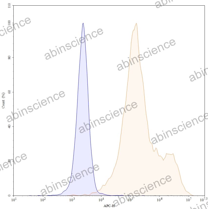 Flow-cytometry using anti-human Claudin18.2 antibody. Untransfected cells (blue Histogram) and Transfected cells (Yellow Histogram) were stained with an anti-human Claudin18.2 monoclonal antibody (Catalog HX126016) at a concentration of 5 µg/ml for 30 mins at RT. After washing, bound antibody was detected using a Goat Anti-Human IgG H&L Polyclonal Antibody, AF647 (abinScience: HF690324) and cells analysed on a NovoCyte Flow Cytometer.
