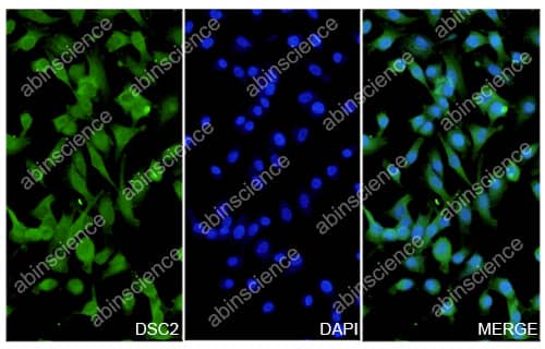 A549 cells were fixed with 4% paraformaldehyde for 20 minutes, followed by blocking with 5% goat serum for 1 hour. The cells were then incubated with a primary antibody targeting DSC2 (HX236014) at a concentration of 93.35 ug/ml overnight at 4°C. Afterward, the cells were incubated with a secondary antibody, Goat Anti-Rabbit IgG (Alexa Fluor-488) for 50 minutes at room temperature. The localization of DSC2 was visualized (shown in green), and nuclear DNA was stained with DAPI (shown in blue).