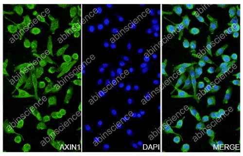 A549 cells were fixed with 4% paraformaldehyde for 20 minutes, followed by blocking with 5% goat serum for 1 hour. The cells were then incubated with a primary antibody targeting AXIN1 (HT232014) at a concentration of 13.5 ug/ml overnight at 4°C. Afterward, the cells were incubated with a secondary antibody, Goat Anti-Rabbit IgG (Alexa Fluor-488) for 50 minutes at room temperature. The localization of AXIN1 was visualized (shown in green), and nuclear DNA was stained with DAPI (shown in blue). |
