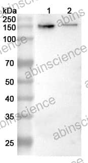 Western blot analysis was performed using anti-GRIN2B polyclonal antibody at 1ug/mL on various samples. Lane 1: Mouse brain lysate Lane 2: Rat brain lysate