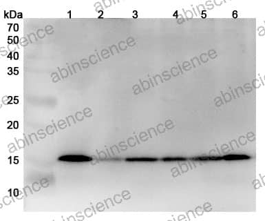 Western blot analysis was performed using anti-MAGOH polyclonal antibody at 1ug/mL on various samples. Lane 1: Hela cell lysate Lane 2: HL60 cell lysate Lane 3: K562 cell lysate Lane 4: Raji cell lysate Lane 5: Jurkat cell lysate Lane 6: Lncap cell lysate