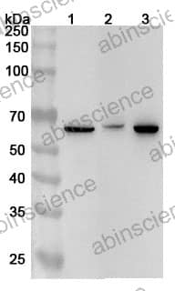 Western blot analysis was performed using anti-SALL4 polyclonal antibody at 1ug/mL on various samples. Lane 1: HepG2 cell lysate Lane 2: PC-12 cell lysate Lane 3: Raji cell lysate