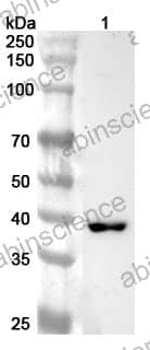 Western blot analysis was performed using anti-EXOG polyclonal antibody at 1µg/ml on various samples. Lane 1: MCF-7 cell lysate