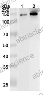 Western blot analysis was performed using anti-CEP131 polyclonal antibody at 1µg/ml on various samples. Lane 1: Mouse testis lysate Lane 2: Rat testis lysate