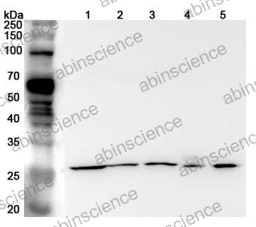 Western blot analysis was performed using anti-APCS polyclonal antibody at 1ug/mL on various samples. Lane 1: 293T cell lysate Lane 2: Hela cell lysate Lane 3: HepG2 cell lysate Lane 4: Mouse liver lysate Lane 5: Mouse kidney lysate