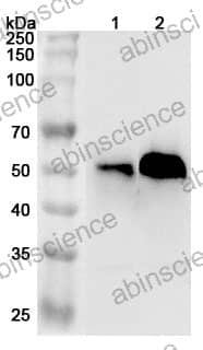 Western blot analysis was performed using anti-AHSG polyclonal antibody at 1µg/ml on various samples. Lane 1: Mouse liver lysate Lane 2: Mouse heart lysate