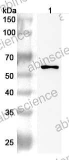 Western blot analysis was performed using anti-CSF1R polyclonal antibody at 1ug/mL on various samples. Lane 1: THP-1 cell lysate