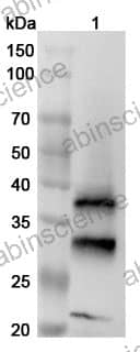 Western blot analysis was performed using anti-CTSB polyclonal antibody at 1µg/ml on various samples. Lane 1: RAW264.7 cell lysate