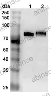 Western blot analysis was performed using anti-CD36 polyclonal antibody at 1µg/ml on various samples. Lane 1: Mouse lung lysate Lane 2: Mouse heart lysate