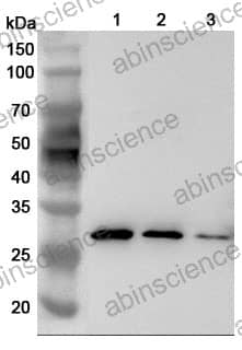 Western blot analysis was performed using anti-LGALS3 polyclonal antibody at 1ug/mL  on various samples. Lane 1: MCF-7 cell lysate Lane 2: HepG2 cell lysate Lane 3: Caco2 cell lysate