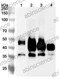 Western blot analysis was performed using anti-BSG polyclonal antibody at 1ug/mL on various samples. Lane 1: U87 cell lysate Lane 2: Mouse spleen lysate Lane 3: Mouse heart lysate Lane 4: Mouse liver lysate