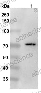 Western blot analysis was performed using anti-IL18R1 polyclonal antibody at 1ug/mL on various samples. Lane 1: Jurkat cell lysate