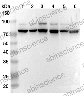 Western blot analysis was performed using anti-VSIG1 polyclonal antibody at 1ug/mL on various samples. Lane 1: BxPC-3 cell lyssate Lane 2: SGC-7901 cell lysate Lane 3: MCF-7 cell lysate Lane 4: Mouse testis lysate Lane 5: Rat testis lysate Lane 6: Rat ovary lysate