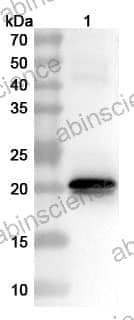 Western blot analysis was performed using anti-ASFV War-135/pE184L polyclonal antibody at 1ug/mL on recombinant ASFV War-135/pE184L (Catalog No. VK427012).